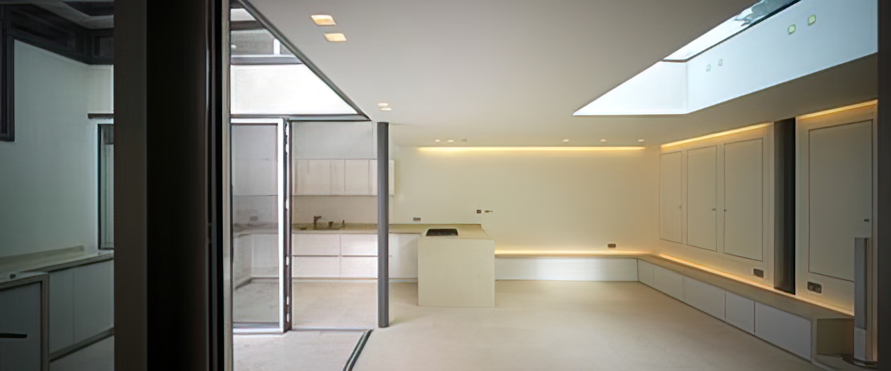 To avoid overlooking neighbours’ properties and gardens there is an internal courtyard as part of the living and kitchen dining room, for internal light and fresh air, other rooms have clerestory windows with the bedrooms opening onto the rear external planted areas and tree.